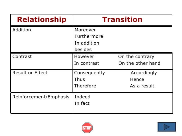 There are two basic types of transitions, conjunctive adverbs and conjunctions. Another type of transition is called a referent. Transition words and phrases are used to clarify the relationships between sentences.